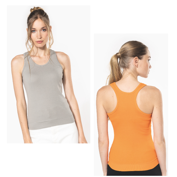 100% coton. Côte 1x1. Dos nageur. Finition double aiguille.