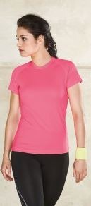 T-SHIRT SPORT FEMME 100% polyester. Tissu léger à séchage rapide. Biais à l'encolure. Manches raglan avec points de recouvrement. Finition double aiguille au bas des manches et au bas du vêtement.